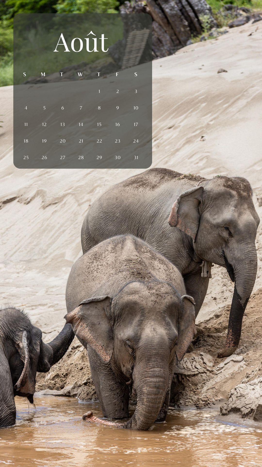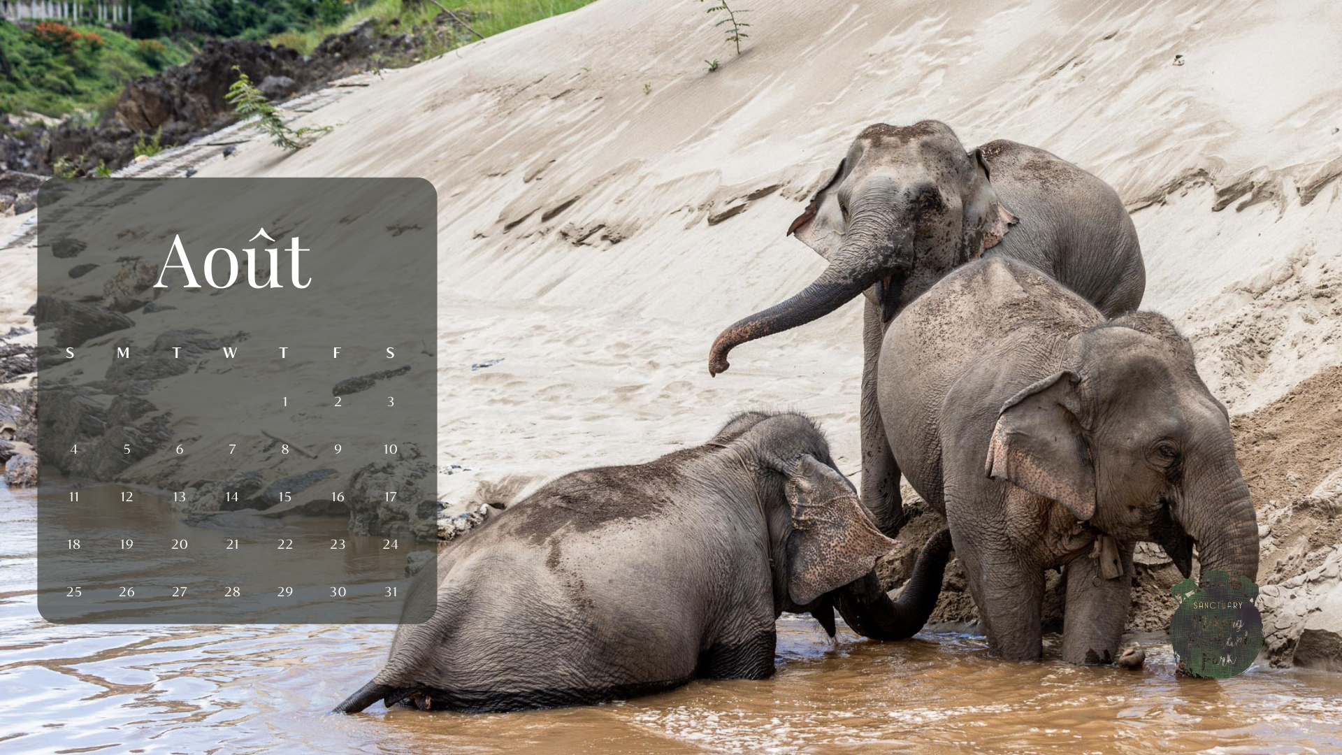 Dans l’esprit de la Journée mondiale des éléphants et compte tenu des premières grosses averses étant au cœur de la mousson, nous avons pensé pour août à faire un clin d’œil à nos éléphants qui profitent au maximum de la saison. Une belle photo de nos femelles Mae Ping, Mae Nat, Mae Nin profitant simplement de leur baignade quotidienne dans le Mékong. Nous espérons que ce magnifique fond d’écran vous rappellera et vous motivera à rendre visite à nos éléphants à l’avenir