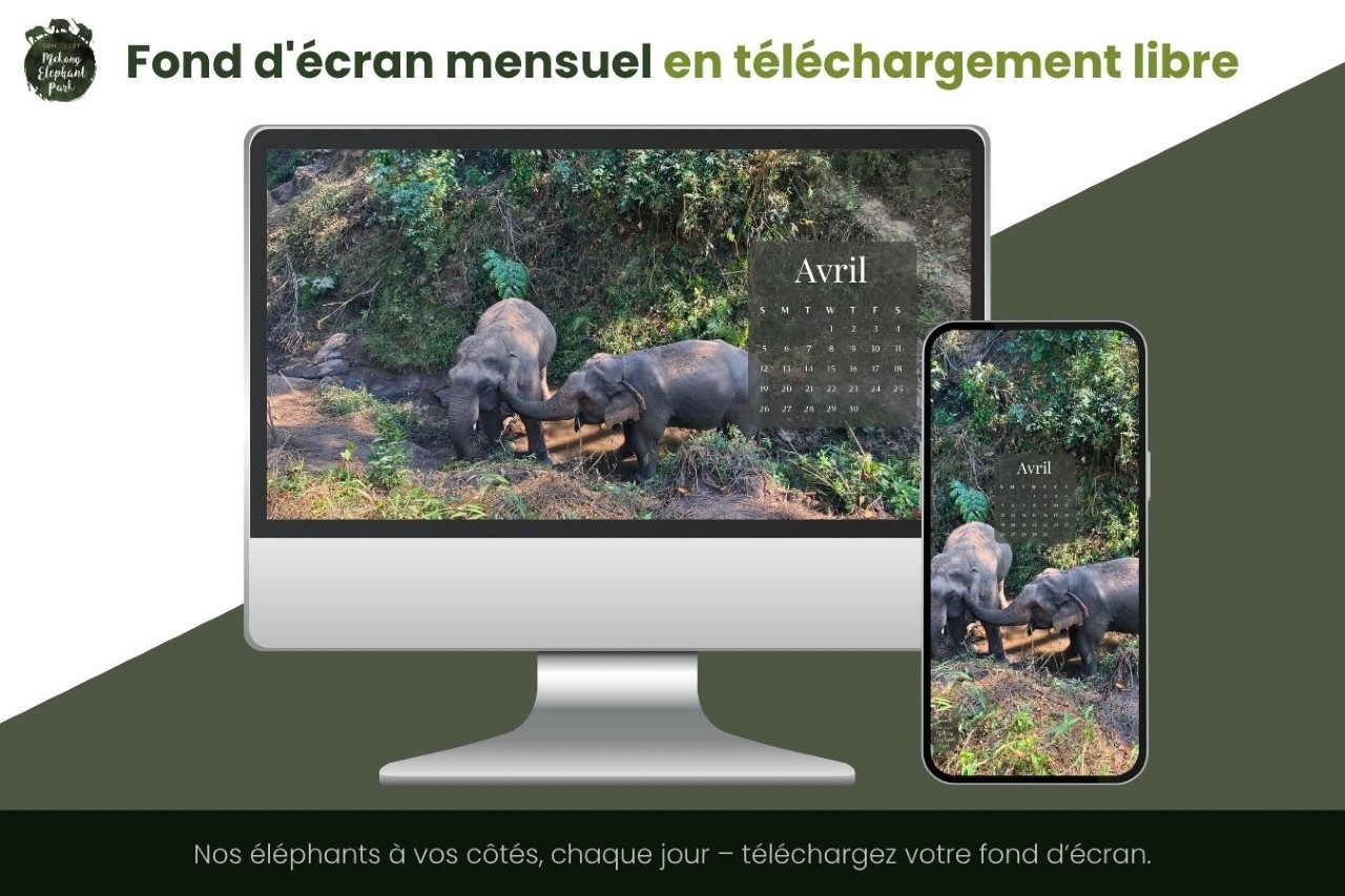 Ce mois-ci, notre fond d’écran met à l’honneur Kham Khoun et Dokeo, nos deux éléphants mâles du moment. Deux présences très différentes, mais complémentaires : la force affirmée de Kham Khoun et le parcours de reconstruction de Dokeo, réunis dans une même image.